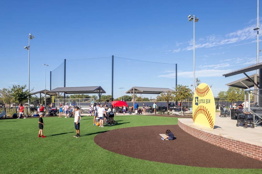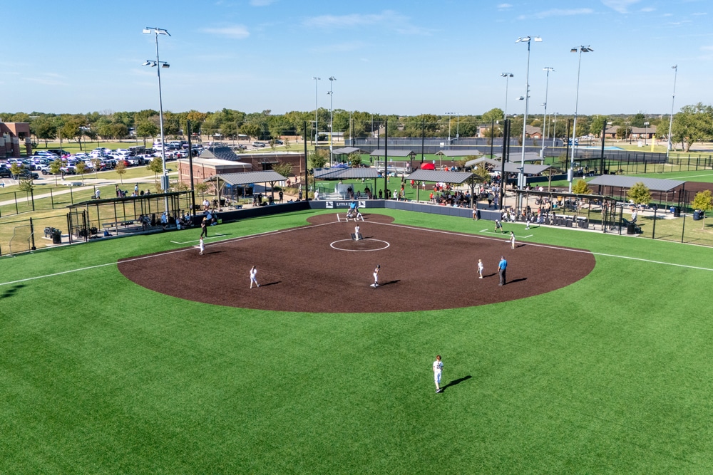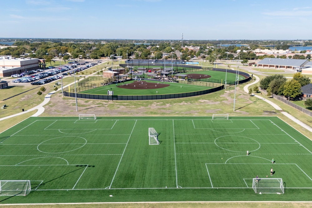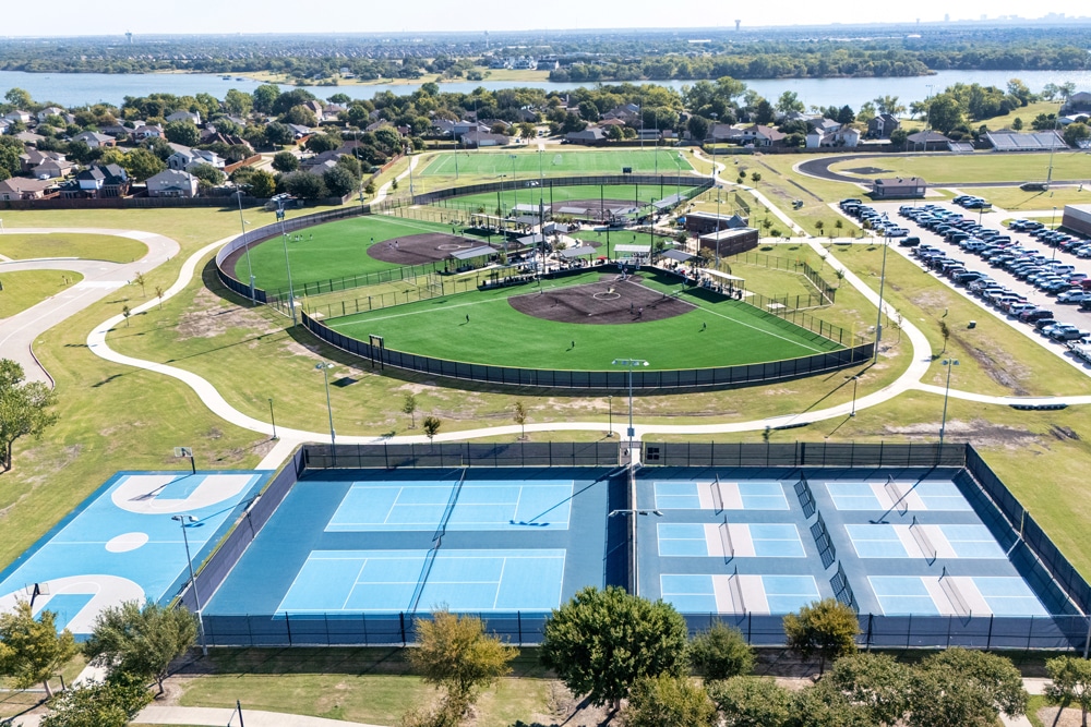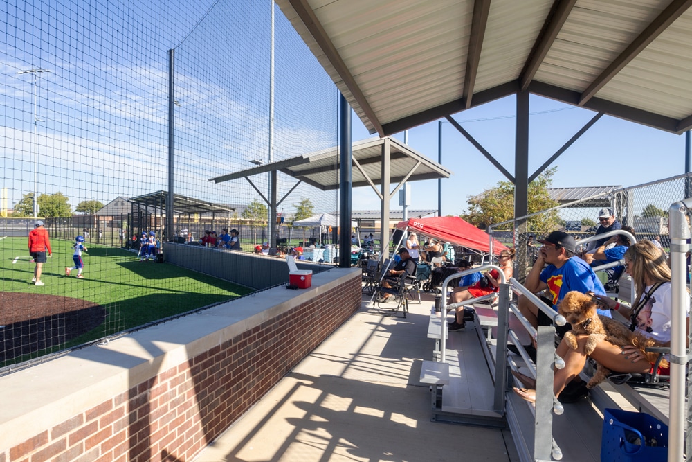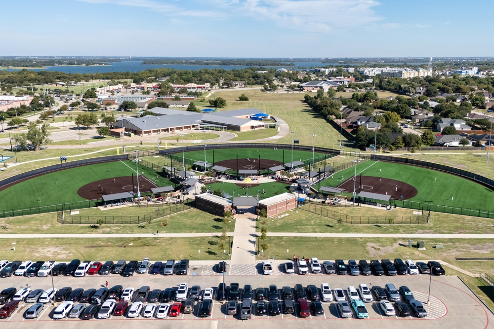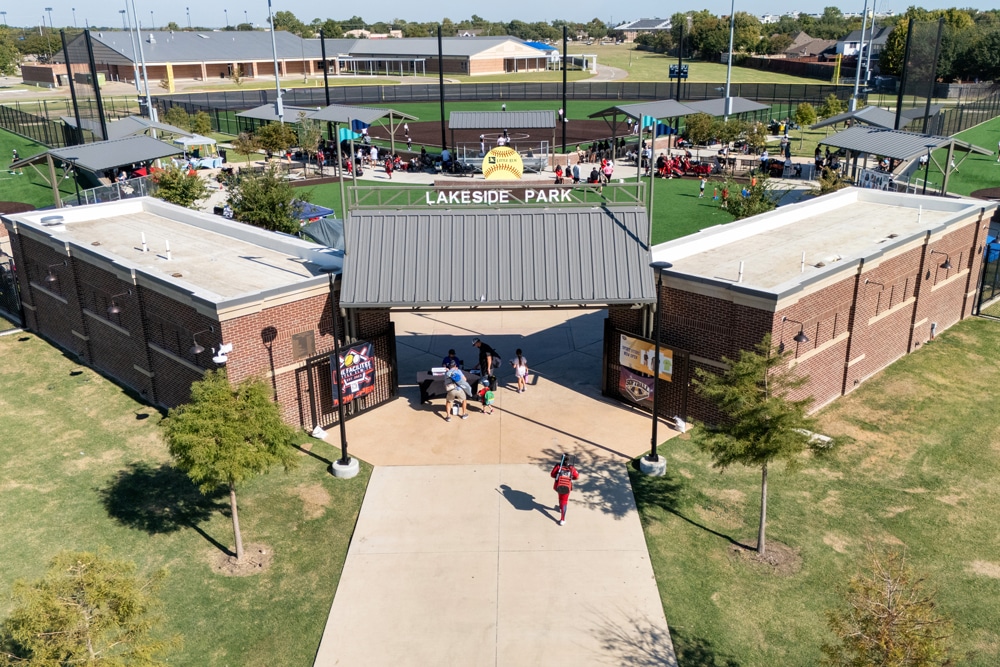 The Lakeside Ballfield Sports Complex features three state-of-the-art softball fields, each equipped with covered dugouts, spectator seating, artificial turf, sports lighting, a post-tension backstop netting system, and an eight-foot high chain link fence with gates. The complex also boasts a custom restroom and concession building that serves as a welcoming gateway.
