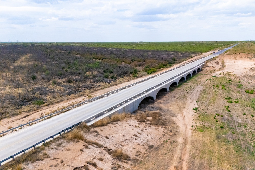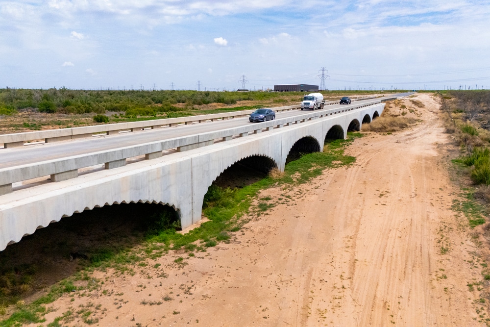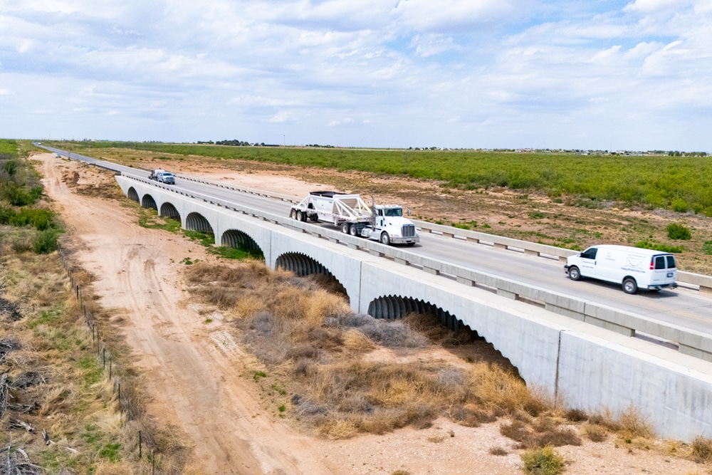 As part of the CR 1232 project, Dunaway provided design, FEMA coordination, a CLOMR, and LOMR for this draw crossing, one of the largest bridge structures in Midland County. The project’s geotechnical engineer indicated that soil conditions were incredibly poor along this half-mile stretch. Dunaway used Geopier as the foundation for the Contech bridge system.